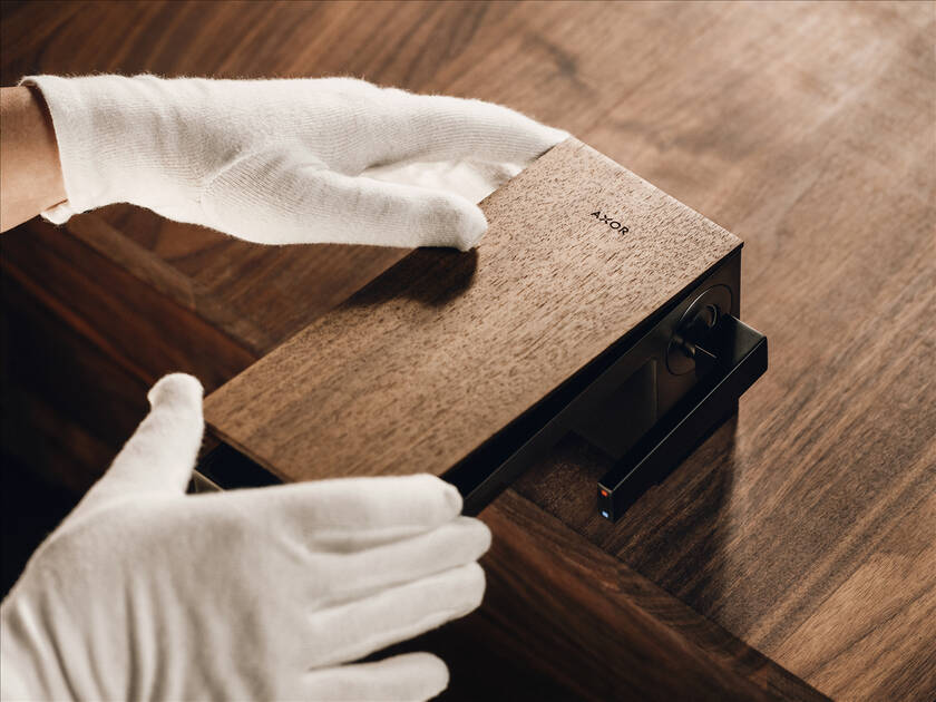 AXOR MyEdition雅生真我系列面板所采用的胡桃木来自北美与加拿大的可持续人工林。所有胡桃木全部根据社会与生态责任规范种植和加工。砍伐胡桃木并锯断后,原材料在加工厂被切成薄片。我们只选用经过分拣、纹理优美的薄片。手工粘合薄片,板条被交叉粘合在一起,形成稳定的结构,确保防潮不卷边。加工后的薄片通过加压,根据成品尺寸切割成型。为增加稳定性,工人们会铣削木板背面并贴上一层不锈钢板,然后用激光镌刻雅生徽标。最后在表面刷油,保护材质的同时亦能美化外观。成品触感丰富,外观迷人:表面光滑,做工精良。在保留天然色调的同时绽放独有的个性光彩。