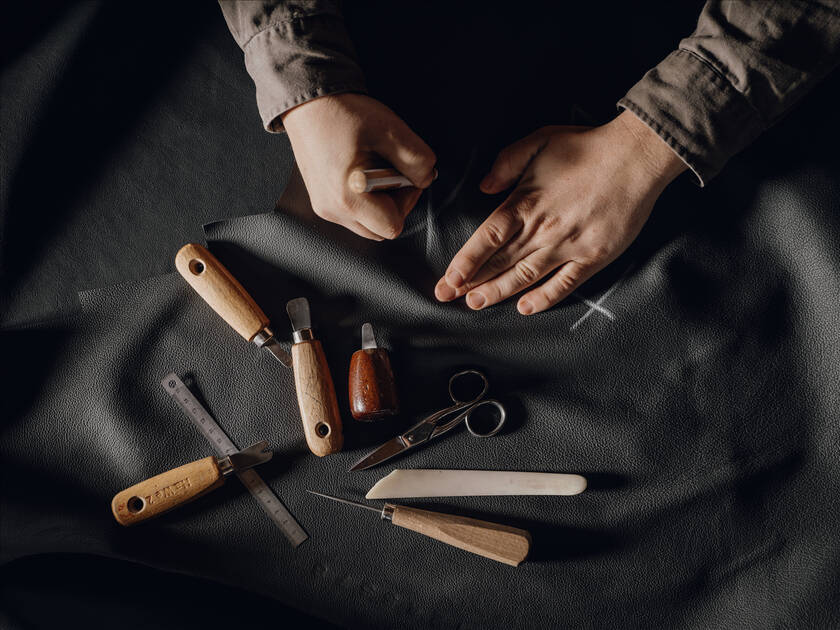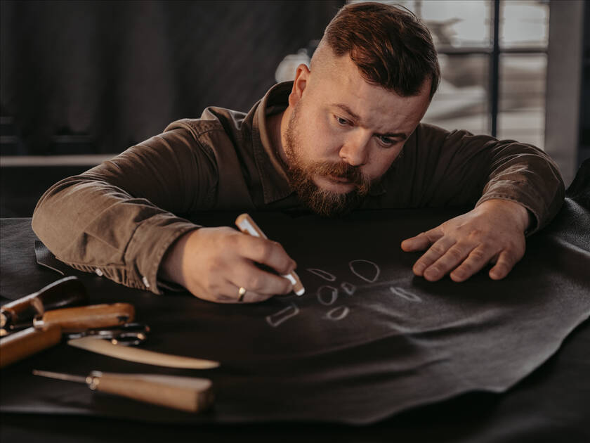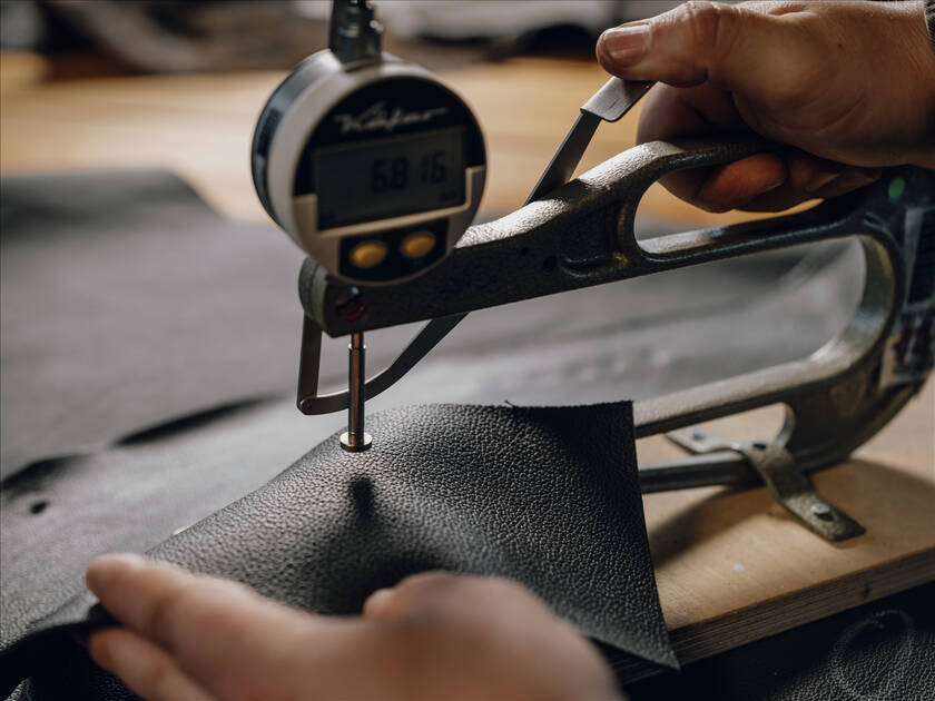 和大理石、胡桃木一样,皮革也是天然材料。AXOR MyEdition雅生真我系列面板所使用的小牛皮来自德国南部或奥地利。每一块生皮都经过人工核检,确保切割后的成品不含任何表面瑕疵。牛皮被分切成一毫米厚度,用于包覆精致的物品,例如AXOR MyEdition真我系列的面板。