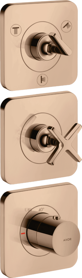 用作3路分水器:和型号no.36702000和no.36771000组合精确安装时(10 毫米间距) , 请选择订购暗装三功能恒温模块38 x 12 no.36704000以及基础套件 no.36708180